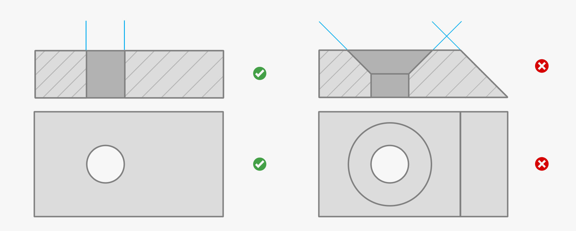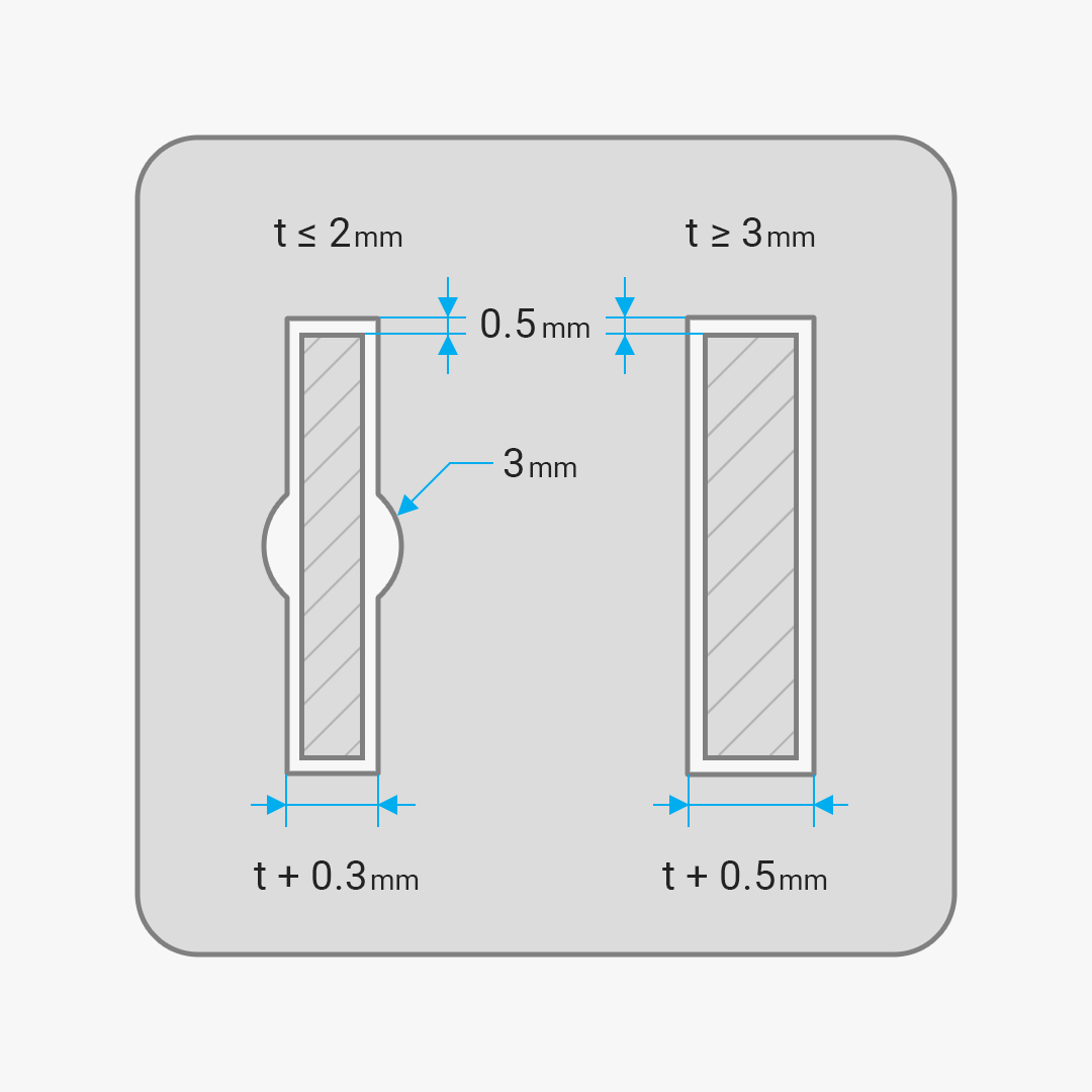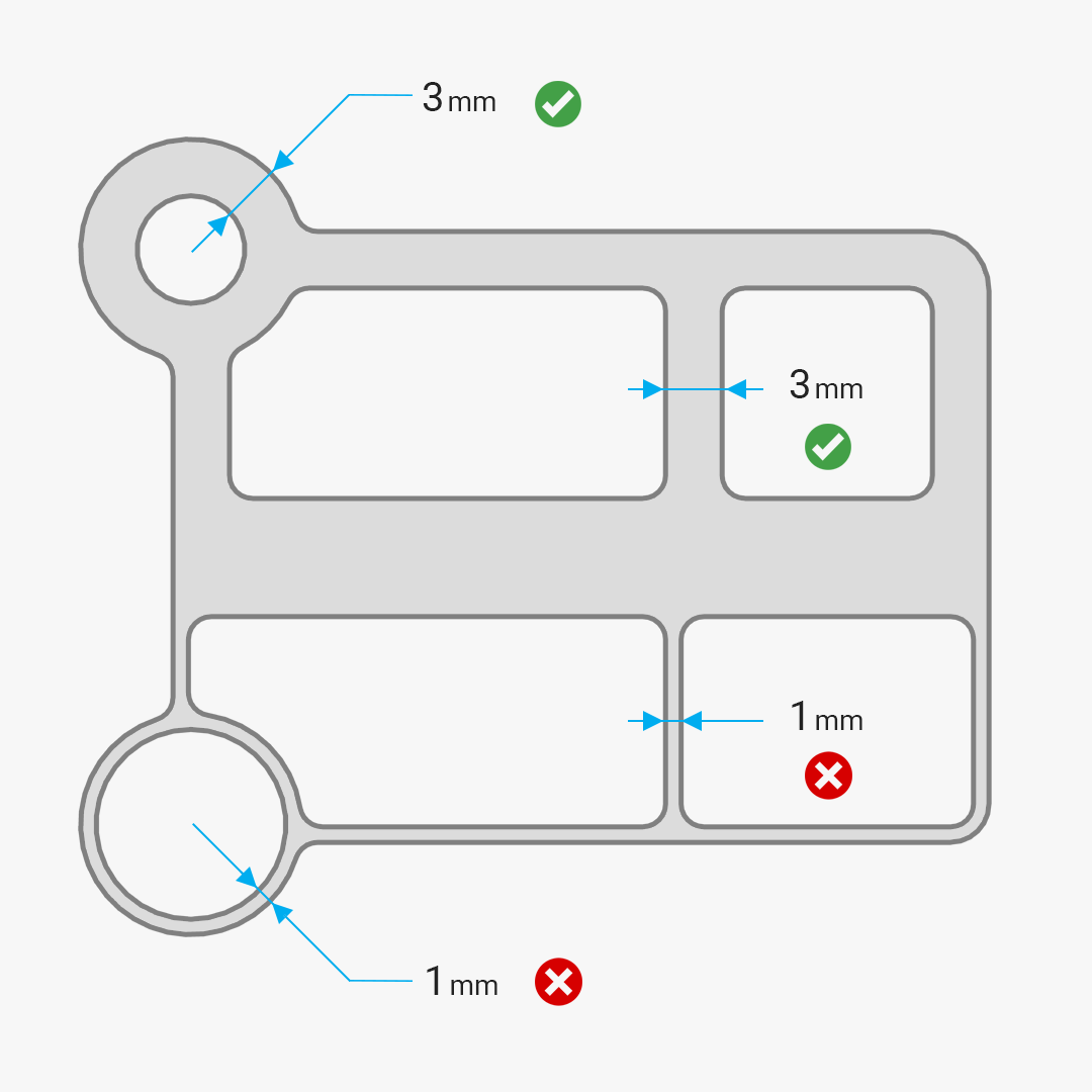 Lassen Sie zwischen den Konturen eine Wandstärke von mindestens 3 mm ein. Wände mit einer Dicke von weniger als 3 mm können geschnitten werden, neigen jedoch zum Absplittern, was zu einer Beeinträchtigung der Festigkeit führen kann.