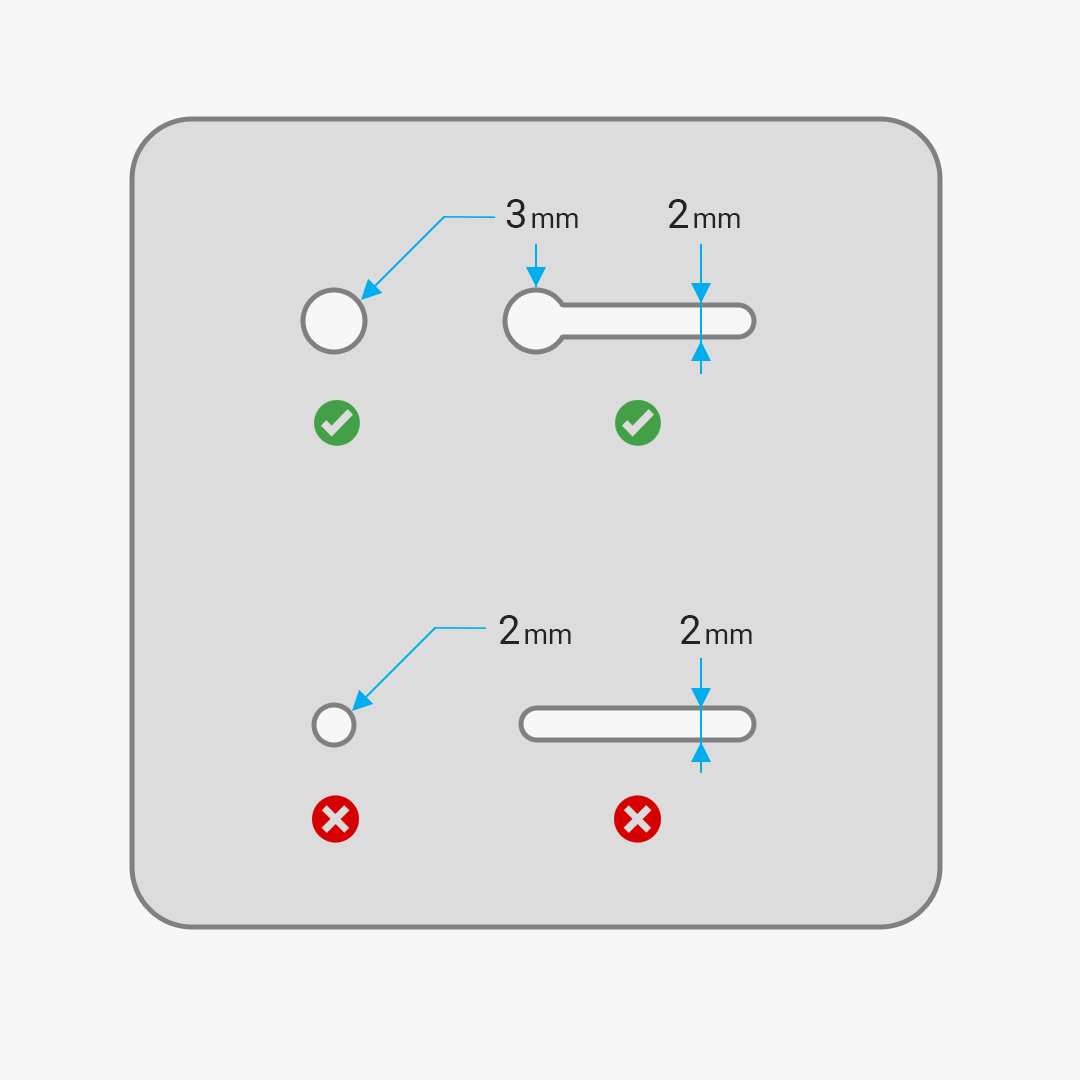 Alle Löcher müssen einen Mindestdurchmesser von 3 mm haben, damit der Strahl ohne die Gefahr einer Delaminierung in das Loch eindringen kann. Das Gleiche gilt für Schlitze und Innenkonturen. Es ist jedoch möglich, Schlitze oder Merkmale bis zu einer Größe von 1 mm zu schneiden, solange diese Merkmale mit einer Kontur mit einem Hohlraum von 3 mm Durchmesser verbunden sind.