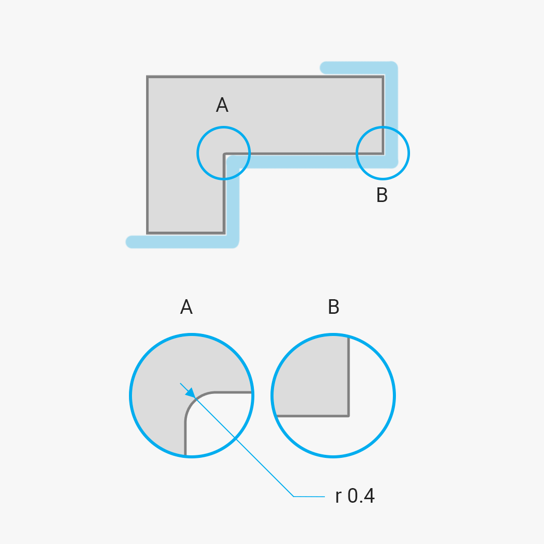 Alle scharfen Innenecken haben aufgrund der Breite des Wasserstrahls einen Radius von 0,4 mm. Außenecken bleiben scharf. Es empfiehlt sich, in jeder Innenecke einen Radius anzubringen, da scharfe Ecken aufgrund hoher Beanspruchung anfällig für Beschädigungen sind.